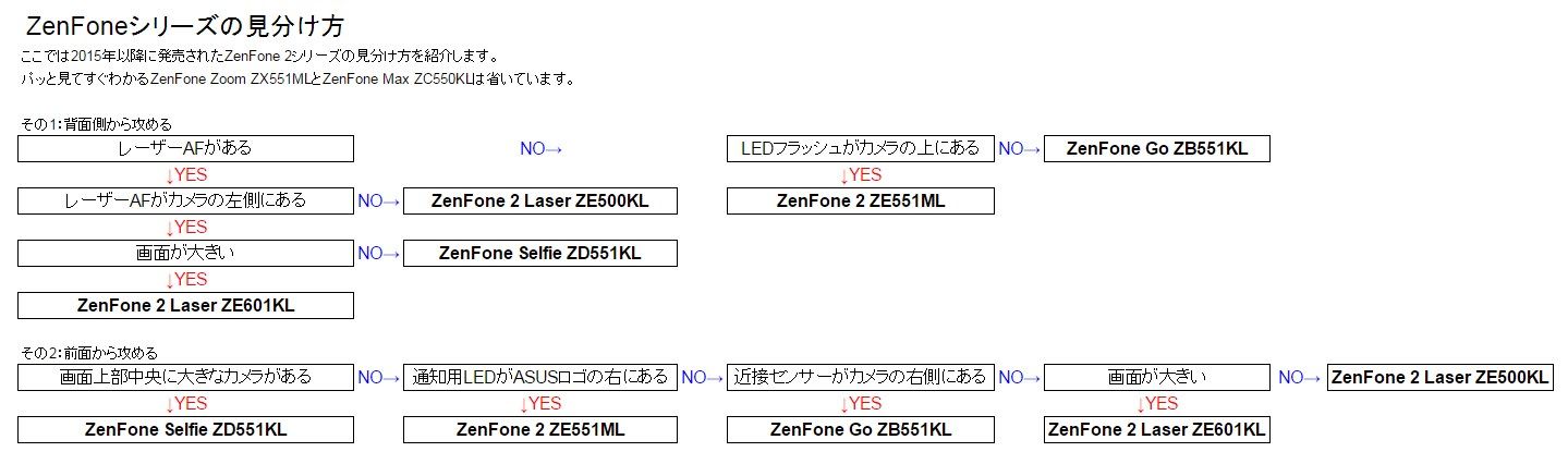 ということで、フローチャートを作ってみました。存在感のあるカメラを搭載したZenFone Zoom ZX551MLと、レザー調のZenFone Max ZC550KLは省いています。