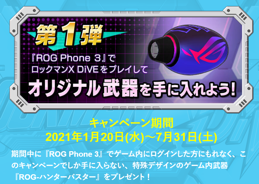 ROG Phone 3でロックマンX DiVEにログインするとコラボ武器「ROG-ハンターバスター」がゲットできます。