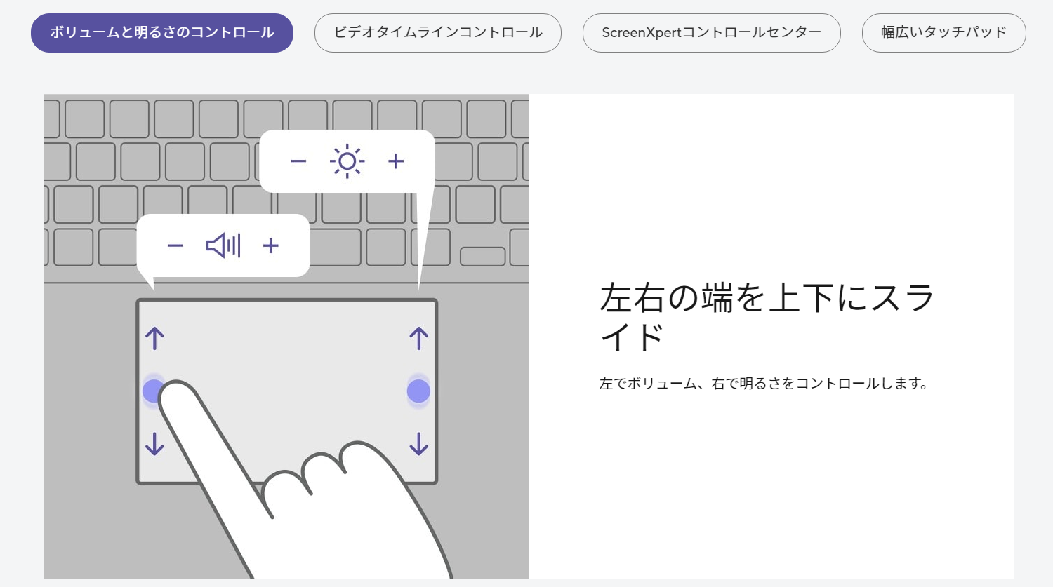新世代のASUSタッチパッドの工夫。シンプルに大きく広いタッチパッドで、さらにスワイプ操作などの独自機能を備えています。
