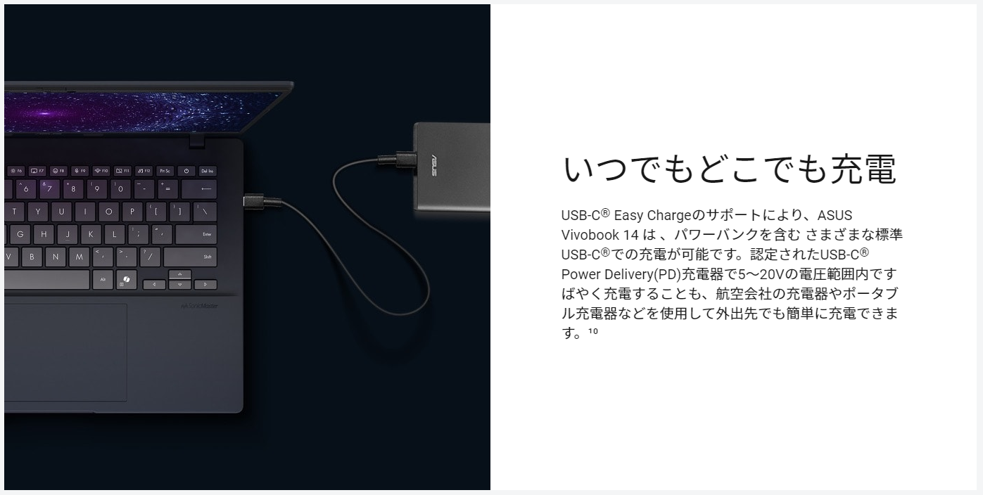 ASUSがUSB-C Easy Chargeと呼ぶこの機能。USB PDに広く対応することでスマホ用の低出力な充電器でも受け入れられるようになっています。14インチのこの製品は持ち運ぶ機会が多いでしょうから、充電手段を選ばないのは武器と言えます。