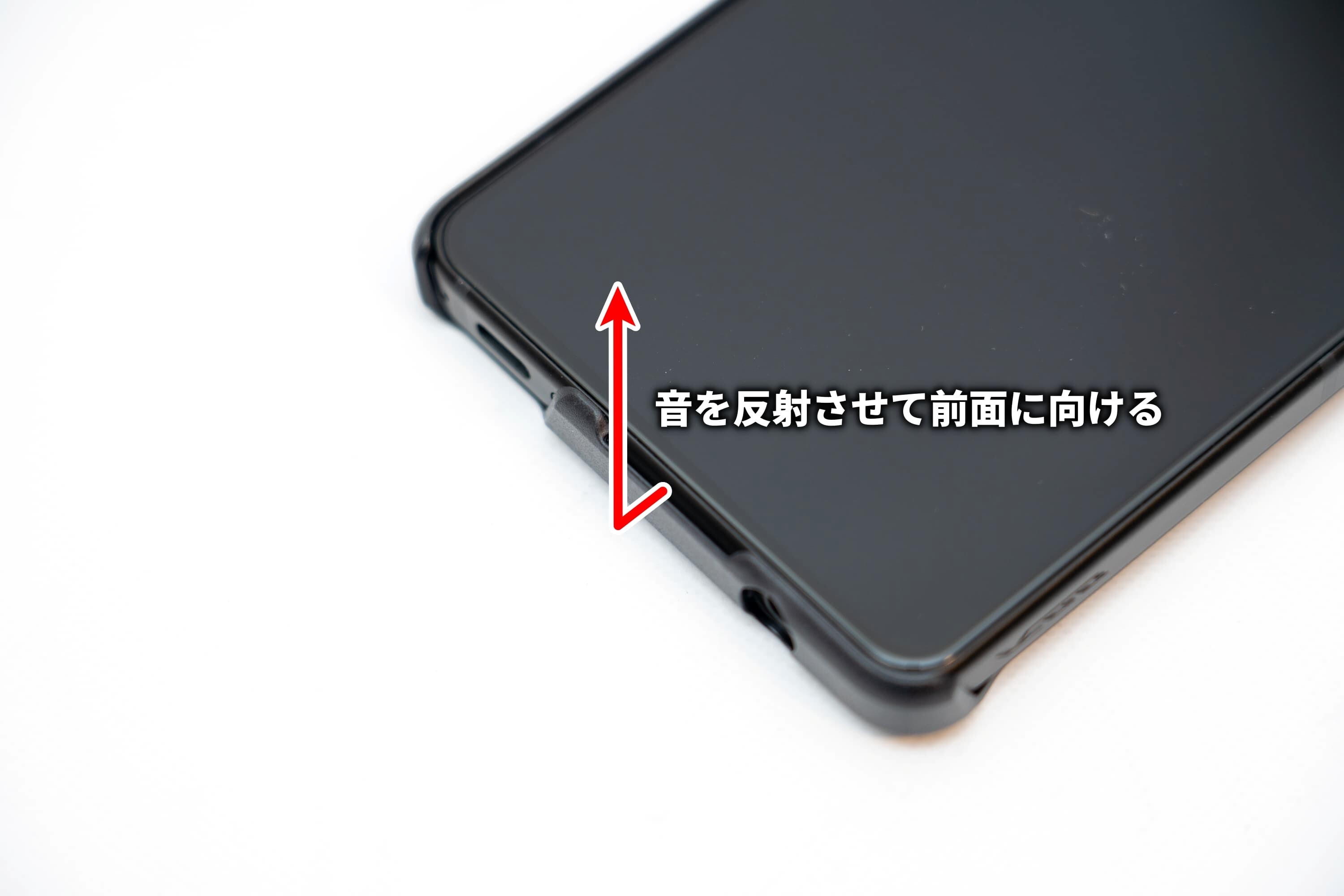 ROG Phone 9 シリーズは一般てなスマホと同じように、前面上部の受話部と底面にスピーカーを搭載しています。ステレオスピーカーとして振る舞いますが、底部は音の出る方向が異なり変則的なステレオといえます。その音のベクトルを変え、フロントステレオスピーカーのようなオーディオ体験を目指したのがこの「オーディオリダイレクト」です。ケースに反射板になる部分があり、音を前面に向けます。