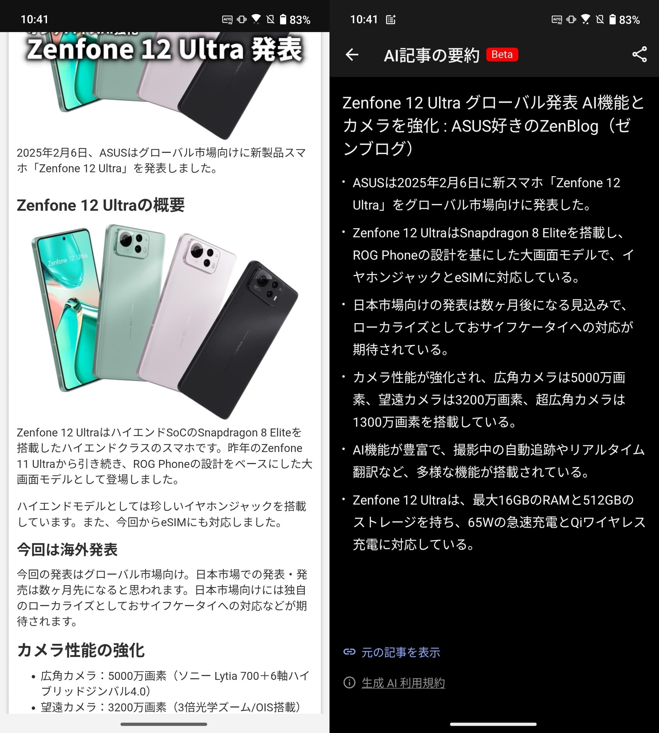 その中でもベータ版としてインストールされている独自アプリ「AI記事の要約」が便利です。Chromeでウェブ上の記事を表示し、「AI記事の要約」へ共有をかけると数秒で記事内容を簡潔にまとめてくれます。記事内容をじっくり読み込むのも大事ですが、要約して大事な情報をピックアップしてくれるのはありがたいですし、なにより操作が簡単に行えるのがいい感じ。要約自体は一般的なチャットAIでも可能ですが、この使い勝手なら日常的に触ろうという気になります。