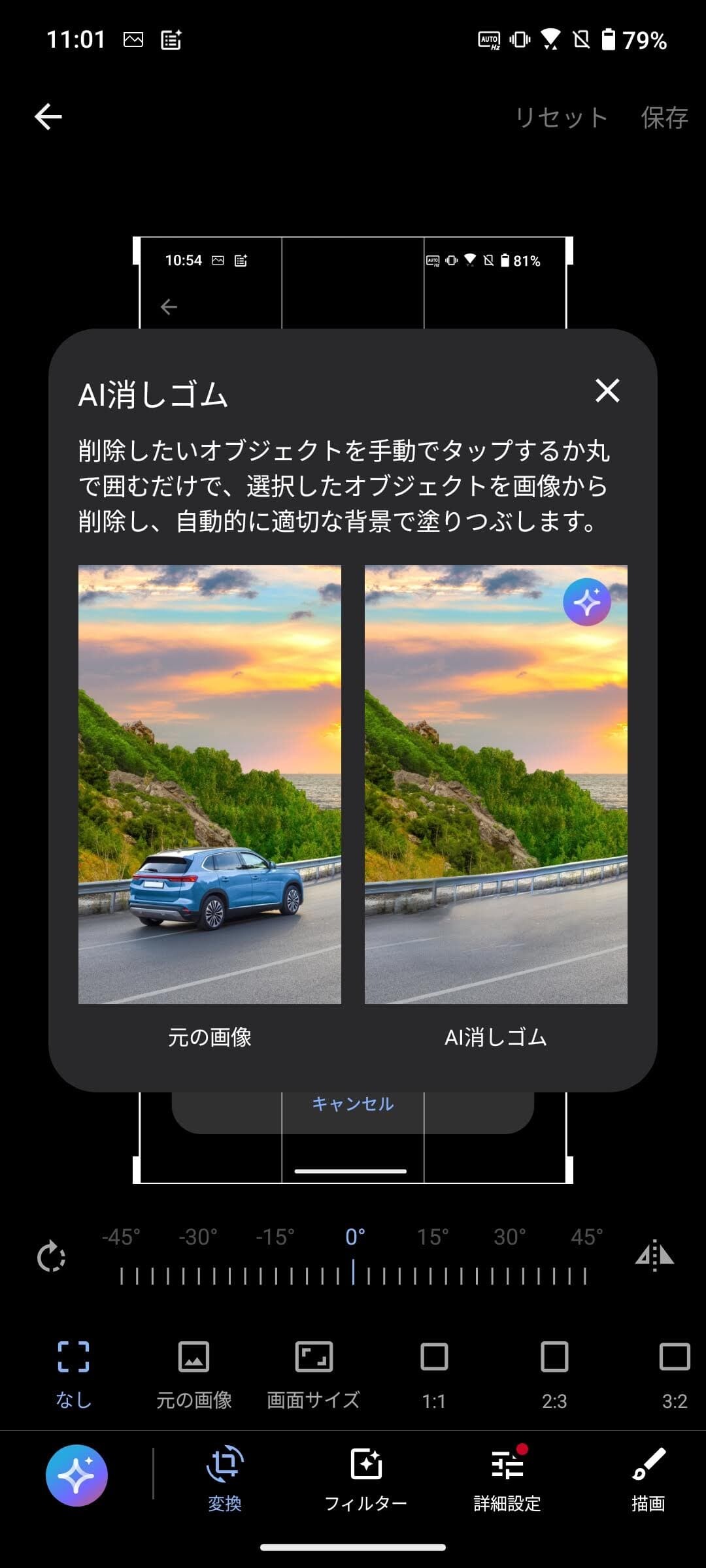 ただし例外もあり、ギャラリーアプリ内には「AI消しゴム」という機能があり、これはまさにGoogleフォトの消しゴムマジックと同じようなものとなっています。