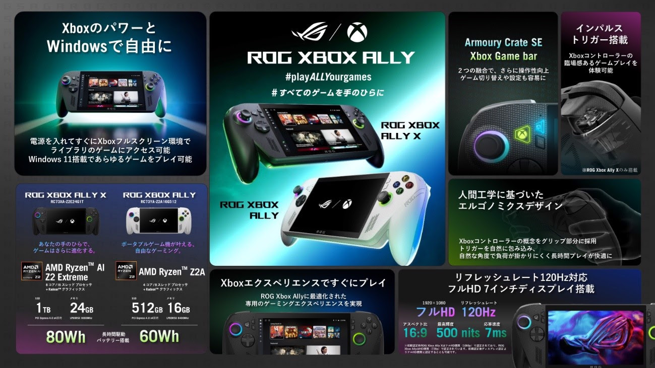 2025年9月26日、ASUS JAPANはハンドヘルドゲーミングPC最新モデル「ROG Xbox Ally X」「ROG Xbox Ally」の予約を開始しました。10月16日発売です。