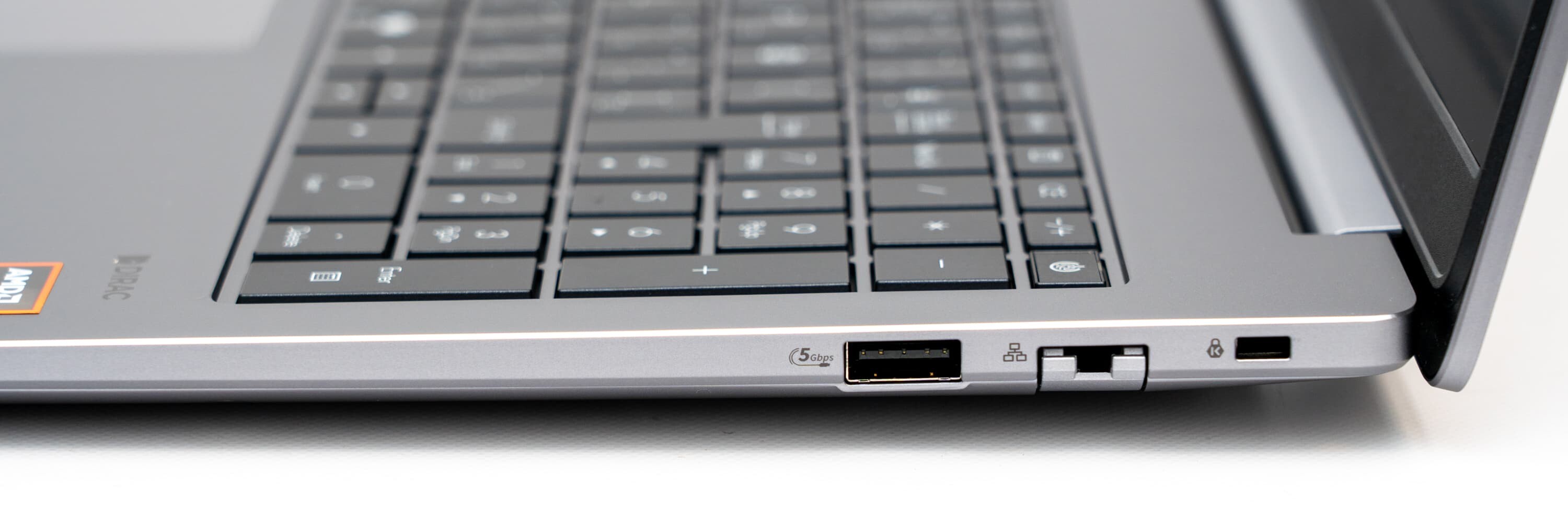 本体右側。こちらにもUSB-Aがあり、さらにLANポートを搭載。アダプター不要で直接挿せるあたりビジネスノートパソコンっぽい。