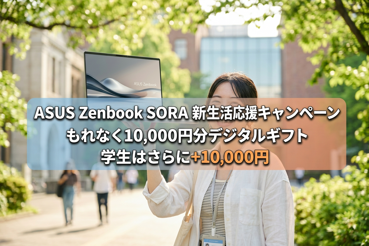 薄型軽量で持ち運びに便利なASUSのノートPC「Zenbook SORA」。現在ASUS JAPANでは、対象の「Zenbook SORA」を購入すると、もれなく1万円分のデジタルギフトがもらえる「新生活応援キャンペーン」を開催中です。さらに学生なら追加で1万円分(最大2万円分)がもらえる大チャンス。